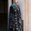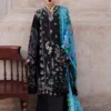 This resplendent black shirt showcases complex floral embroideries where intricate details seamlessly merge, creating a captivating aesthetic. An interesting contrast is introduced by the blue accents within the embroidery, adding a touch of freshness to the floral arrangement. Further enhancing the design are hues of orange, green, blue, pink, and ivory. Complementing the shirt is a printed silk dupatta featuring a coordinating floral print. Completing this ensemble are matching black trousers adorned with subtle embroidery, making it a perfect addition to your wardrobe.
