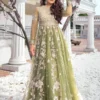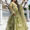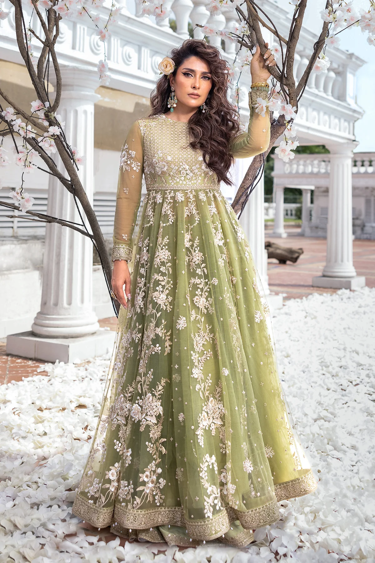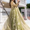 A majestic pistachio green pishwas, resplendently embellished with intricate floral and geometric motifs, exudes an aura of sophistication. The opulent pishwas features lavish embellishments on the front and back, complemented by a stunning organza dupatta adorned with a traditional geometric pattern, channeling timeless elegance and refinement