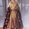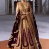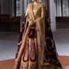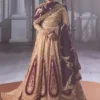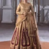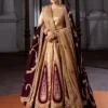 A stunning gold and plum-colored lehenga choli, creating a striking visual effect. The outfit is intricately designed with traditional motifs and embroidery, showcasing a beautiful blend of cultural heritage and elegance.