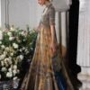 This exquisite ensemble showcases a meticulously crafted pishwas featuring embroidered net panels with embroidered daman border and embroidered sleeves that create a fluid, graceful silhouette with refined detailing. Paired with a printed Korean raw silk sharara, the look is elevated through a rich interplay of texture, structure, and contemporary design. The ensemble is completed with a chiffon dupatta adorned with delicate embroidery and embroidered satin borders adding a light, ethereal finish. Designed for festive celebrations and formal occasions, this outfit embodies elegance, sophistication, and artisanal craftsmanship with a modern aesthetic.