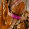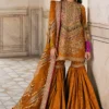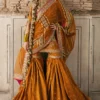 An elegant orange Indian silk shirt and gharara ensemble, adorned with a refined samosa border, contrasting accents, and intricate laser-cut detailing. Subtle 3D adda work adds depth and texture to the design, while an ethereal organza dupatta, delicately finished with a graceful border, completes the look. A timeless expression of traditional beauty with a touch of contemporary sophistication.