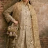 A stunning skin-toned jacket, exquisitely adorned with intricate embroidered jaal and delicate 3D floral motifs, finished with a shimmering pani border for a subtle touch of glamour. It is paired with a beautifully screen-printed organza sharara featuring a pani border, and a sequin sitara–embellished dupatta blooming with soft florals. Together, the ensemble radiates ethereal grace and modern regal allure.