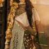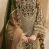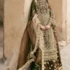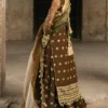 An opulent brown organza long shirt, richly adorned with intricate embroidery, laser-cut detailing, and a gleaming pani border, exudes timeless sophistication. It is paired with a flowing organza sharara and a beautifully printed dupatta, exquisitely finished with a gold badla scalloped edge for a regal and refined touch. A perfect statement of grace and grandeur.