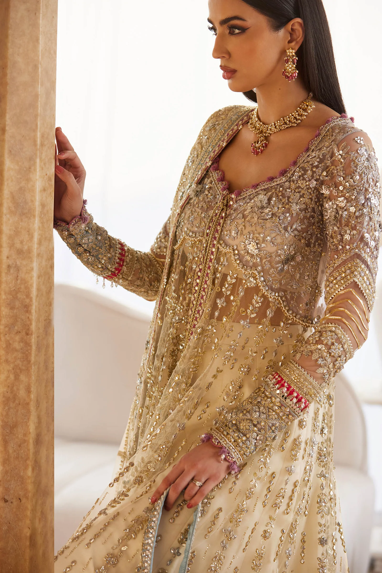 Subtle rose and amethyst threadwork adds tender vibrance, infusing the ensemble with a festive, celebratory aura. Layered over a raw silk lehenga and paired with a gossamer net dupatta edged in a shimmering gota border, this masterpiece radiates luxurious grandeur — perfect for nikkah, engagement, or daytime wedding celebrations.