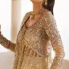 Bathed in ivory, gold and silver, with delicate accents of lavender, rose pink, and ice blue, Zar-e-Mahr unfolds as a vision of bridal elegance and ethereal charm. The sheer net pishwas glimmers with mirror work, tilla, gota, and pearl embroidery, each motif catching the dancing light like morning dew on silk.
